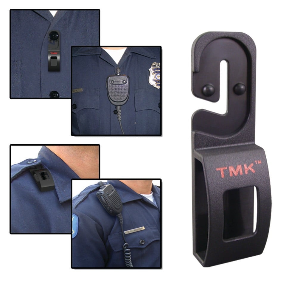 Therefore, the TMK was born. The TMK is a simple, yet reliable and professional solution to the microphone retention problem. It can be worn on the front of the uniform or under the shoulder strap (epaulette). Once in place, the TMK becomes invisible as it is hidden by the microphone. The TMK keeps your microphone safely in place and keeps your uniform professional in appearance as it attaches by way of the uniform button, not the uniform. When in use, the TMK disappears and all that is seen is your mic.