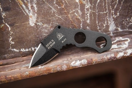 The Tops DEV-02 Devil's Elbow Fixed Blade Knife combines innovative design with robust performance. Measuring 4.5 inches overall, this knife features a 1.75-inch plain edge crafted from 1095 high carbon alloy, providing exceptional durability and edge retention. The black traction coating enhances grip and reduces glare, making it a reliable choice during critical moments. Weighing just 2.9 oz, it's lightweight yet strong, perfect for weapon retention or self-defense. The skeletonized handle ensures a secure hold, while the Kydex sheath with a rotating steel spring clip allows for easy access on the go. Handcrafted in the USA, it’s built to last a lifetime.