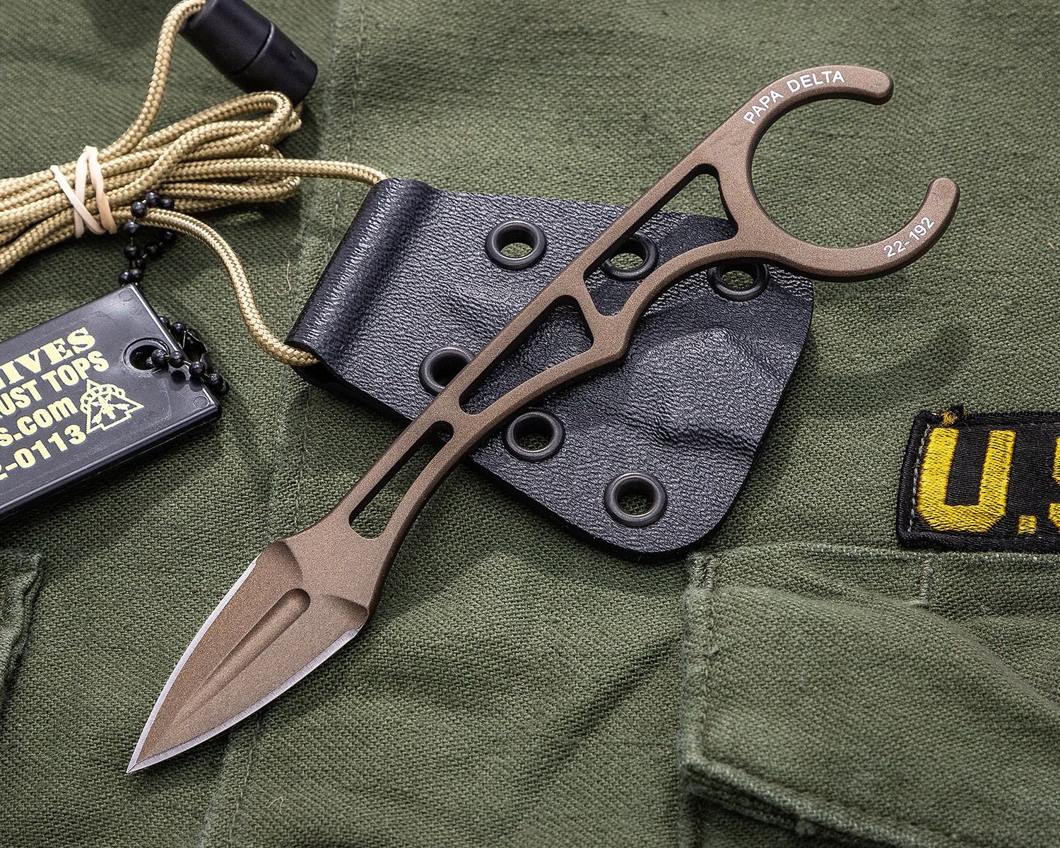 The Tops PD-01 Papa Delta Neck Dagger Knife is a masterfully crafted tool designed for discreet functionality. Created by renowned designer Leo Espinoza with input from a retired police officer, this neck knife features a 1.63" double plain edge blade made from durable 1095 carbon steel. Its skeletonized design ensures low visibility while enhancing grip with a Midnight Bronze Cerakote finish, providing corrosion resistance. The innovative incomplete finger ring allows for quick release in emergencies. Included is a Kydex sheath with a breakaway cord lanyard, making this lightweight knife (0.85 oz) perfect for everyday carry, ensuring it’s always ready when you are.