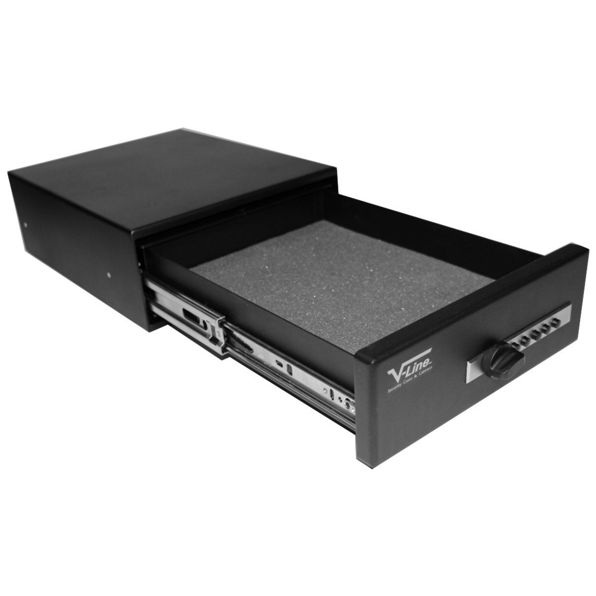 The Slide-Away is V-Line’s new American made multi-purpose heavy duty security case. The Slide-Away is constructed of heavy duty 12 ga. steel with a rugged tactical black powder coating. The smooth operating large pullout drawer sits on ball bearing assisted slides. The drawer is large enough to hold an ipad style tablet or two 1911 type firearms with room to spare for extra magazines. The Slide-Away is versatile enough to mount underneath a desktop or in a small area as long as there is about 4.25″ of clearance. It comes standard with a Quick Release Mounting Bracket for both bottom and top mounting. Optional Full Trays and Half Trays are available for securing and organizing jewelry and other small sized valuables.