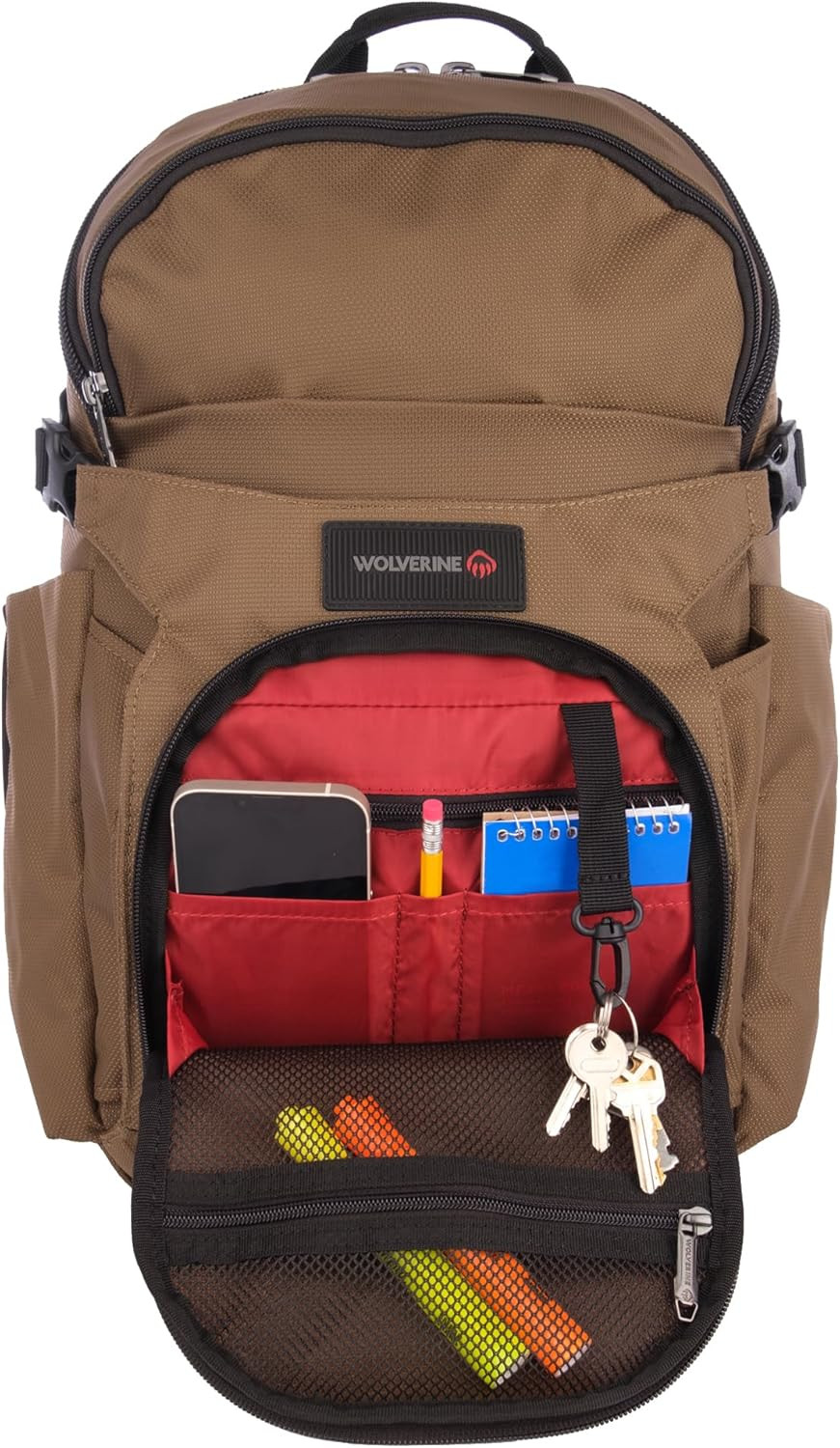 KEEPS YOU ORGANIZED: This WOLVERINE backpack features a dedicated organization compartment with seven pockets and a key hook, providing you with quick and easy access to all your essentials. Additionally, there are two exterior zippered pockets for large water bottles or cords, making it easy to stay hydrated and connected on the go.